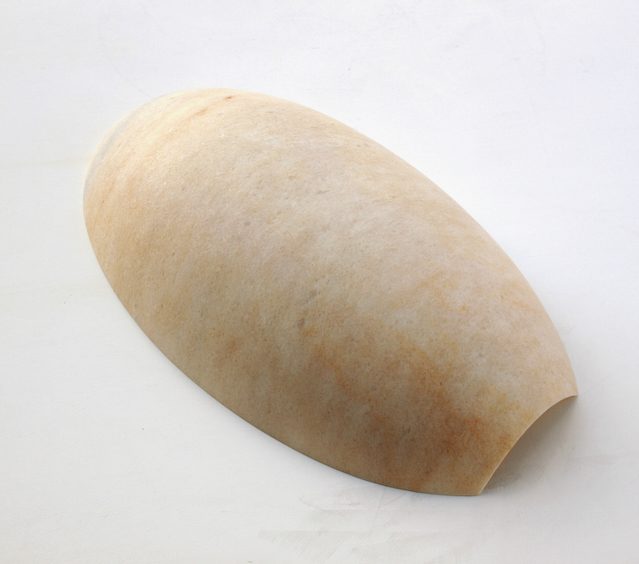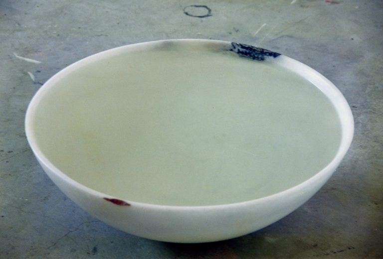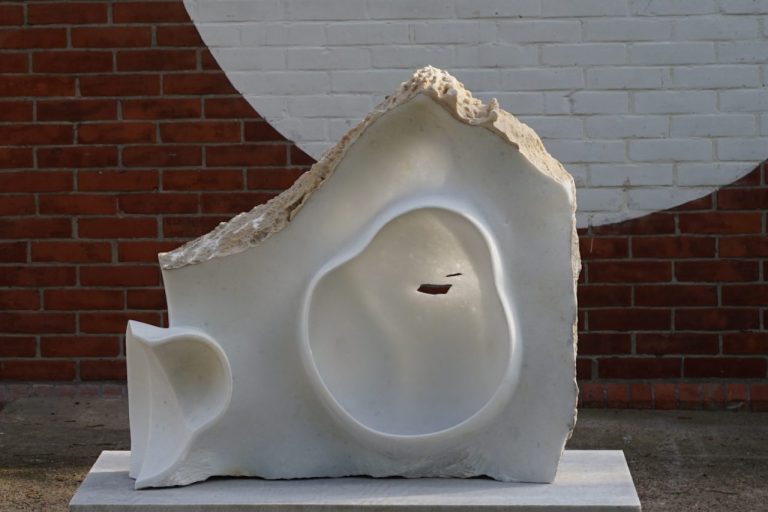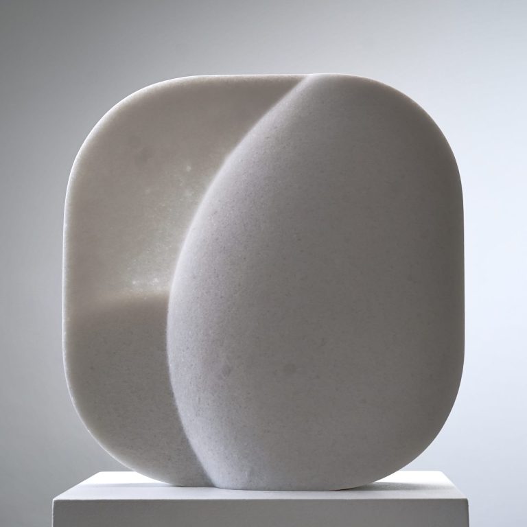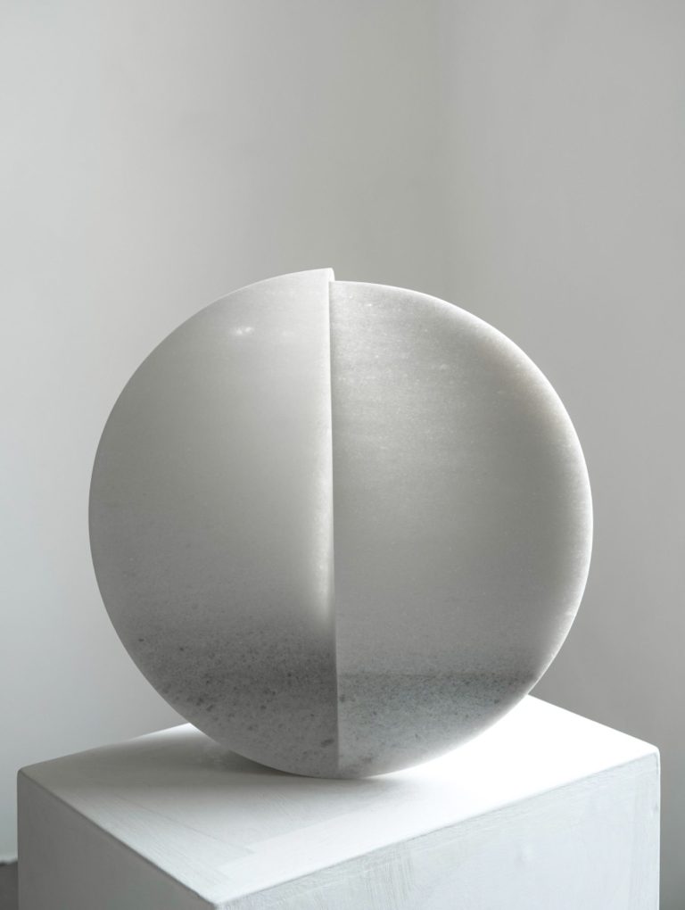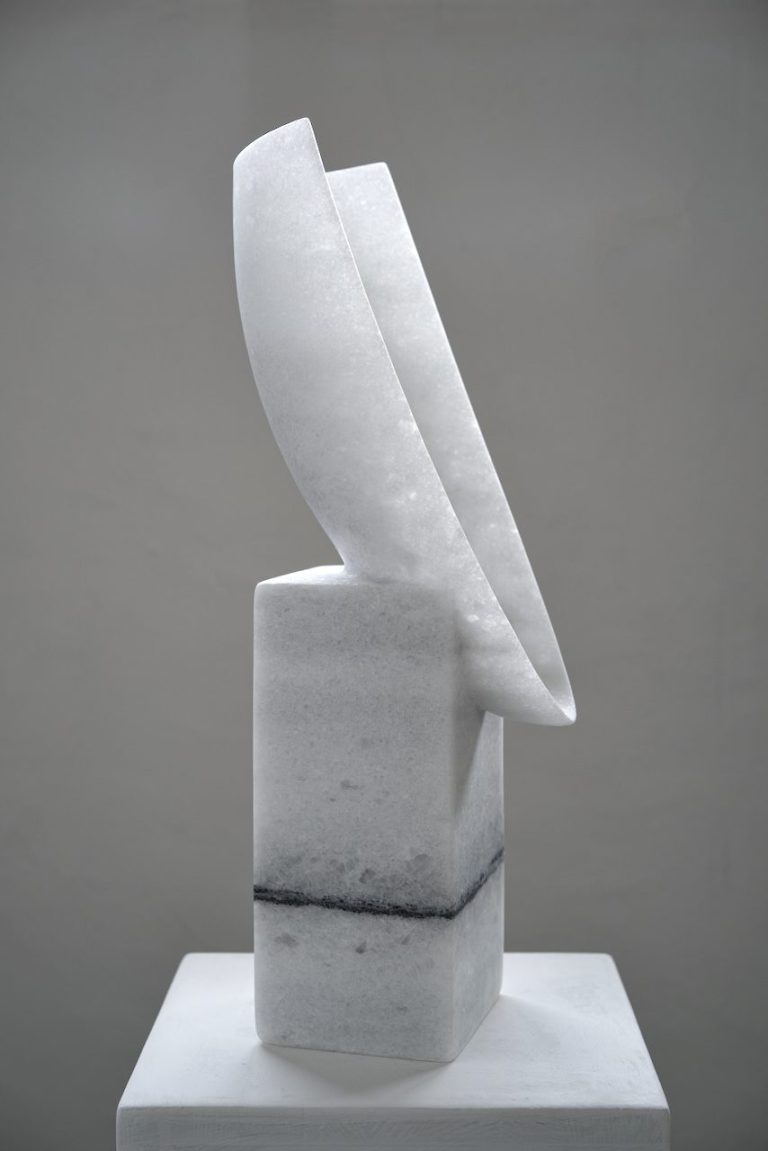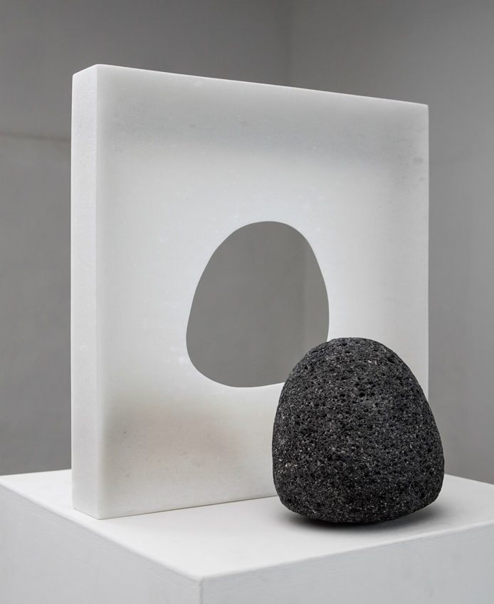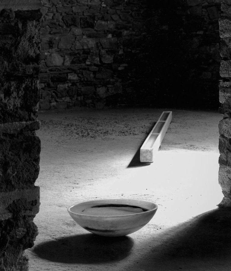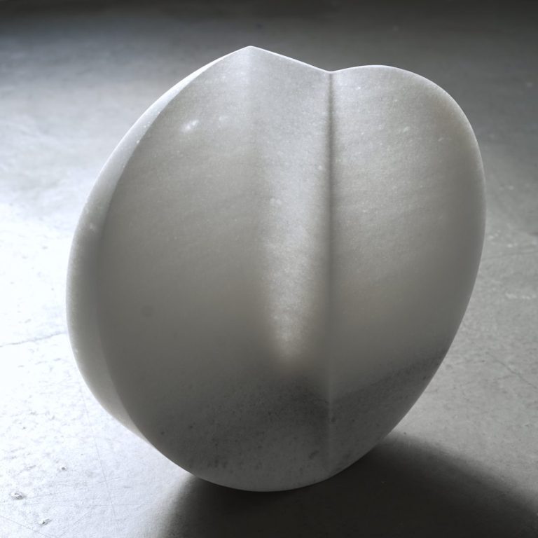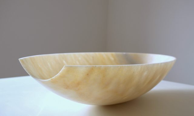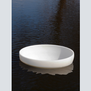 Stein und Wasser - eine große Liebe. Die Gestalt der Schale, mit ihrer gebenden und empfangenden Eigenschaft wurde aus einem Block griechischen Marmors gearbeitet. Sie verbindet den inneren Hohlraum mit dem äußeren Volumen, sie ist der Horizont und die naheliegenste Form für einen Stein um sich schwimmend mit dem Meer zu verbinden.