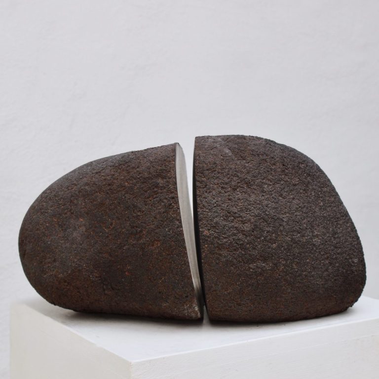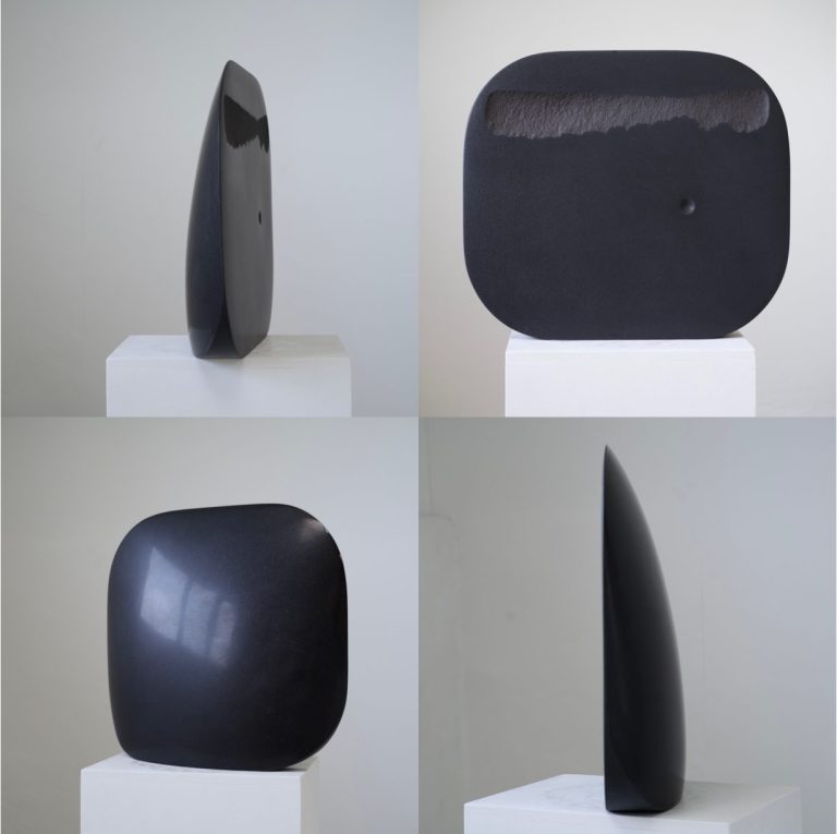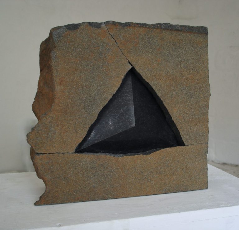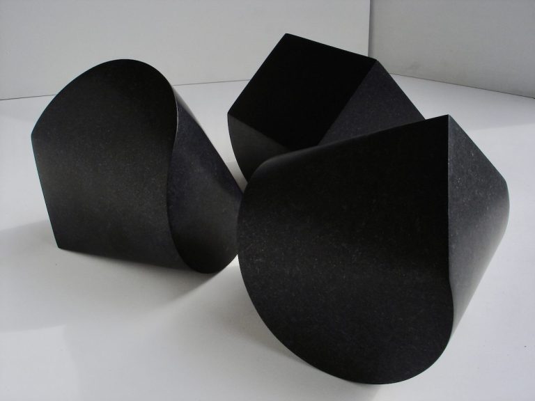 Es heißt, der schwarze Stein aus Schweden entstammt der Erdfrühzeit dem Präkambrium, also vor sehr langer Zeit in der erstmalig vielzellige Tiere mit komplexen Verhaltensmustern ins Bild traten. Es liegt weit außerhalb unserer Vorstellungskraft. Das mit dem wir es als Bildhauer zu tun haben ist ein tief schwarzer, klingender Stein, der uns fasziniert und uns manchmal mit seiner Widerstandskraft zurückweist. Er lässt sich gut spalten und nur mühsam schleifen, ist mit seinen Bruchstücken scharf wie eine Klinge und soll doch weich erscheinen. Nach dem Spalten, Schleifen und Wiederzusammensetzen stehen wir einer künstlichen Trennung gegenüber, einer Art Mauer. Wir denken an ihre Überwindung und den 'Fluss des Lebens'.